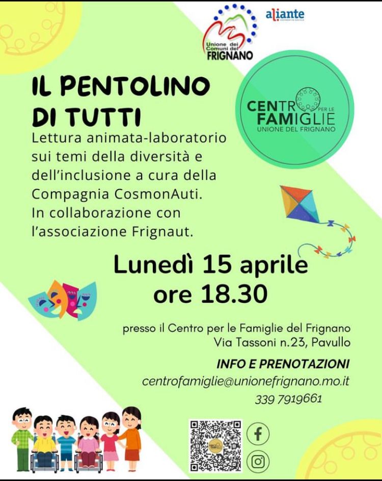 LUNEDI’ 15 APRILE il Centro per le Famiglie del Frignano ospita una lettura animata con laboratorio sui temi dell’inclusione e della diversità, a cura della Compagnia CosmonAuti, in collaborazione con FrignAut!