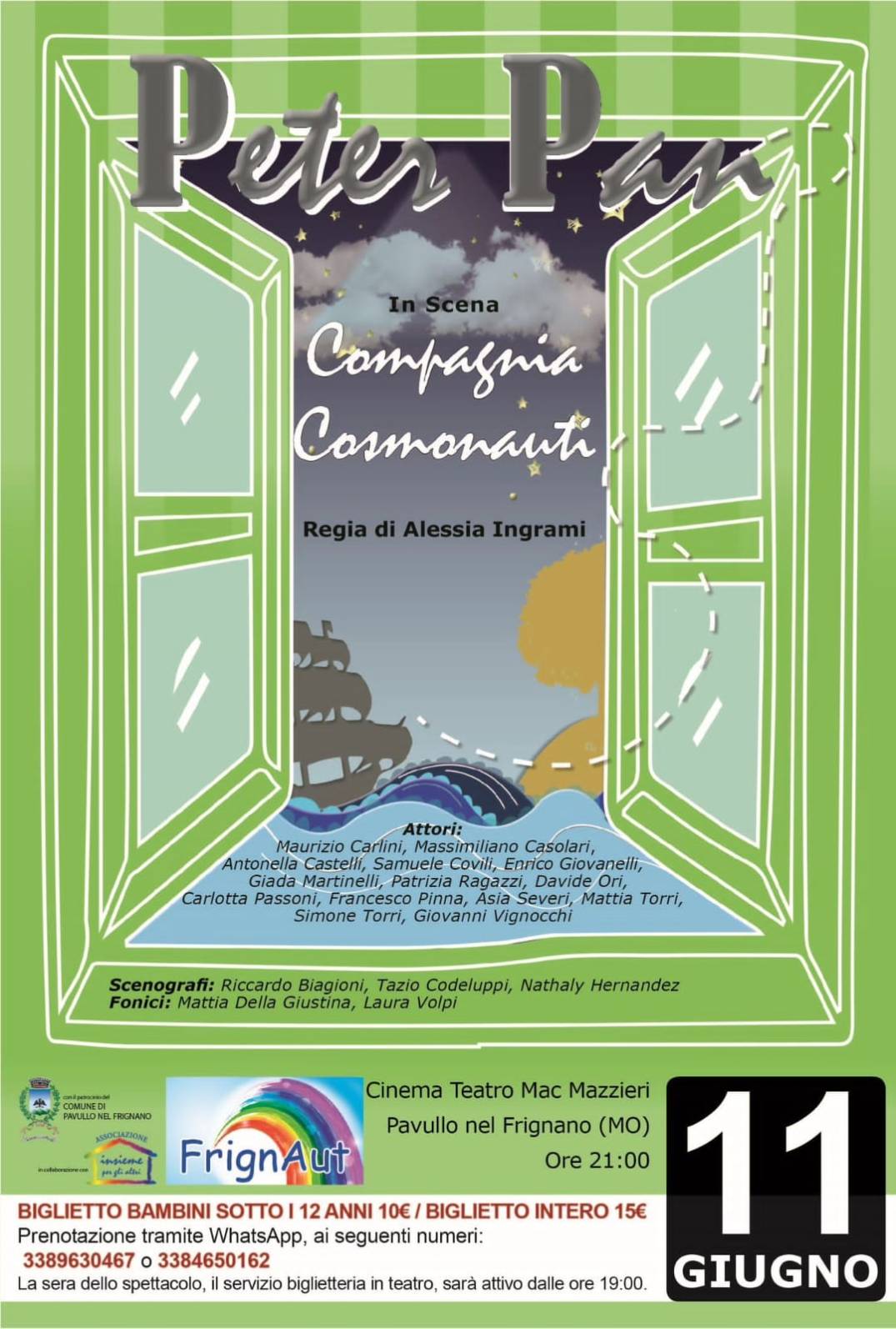 Sono aperte le prenotazioni per lo spettacolo “Peter Pan” della compagnia teatrale Cosmonauti, che si terrà martedì 11 giugno alle ore 21.00 presso il Cinema Teatro W.Mac Mazzieri di Pavullo!
