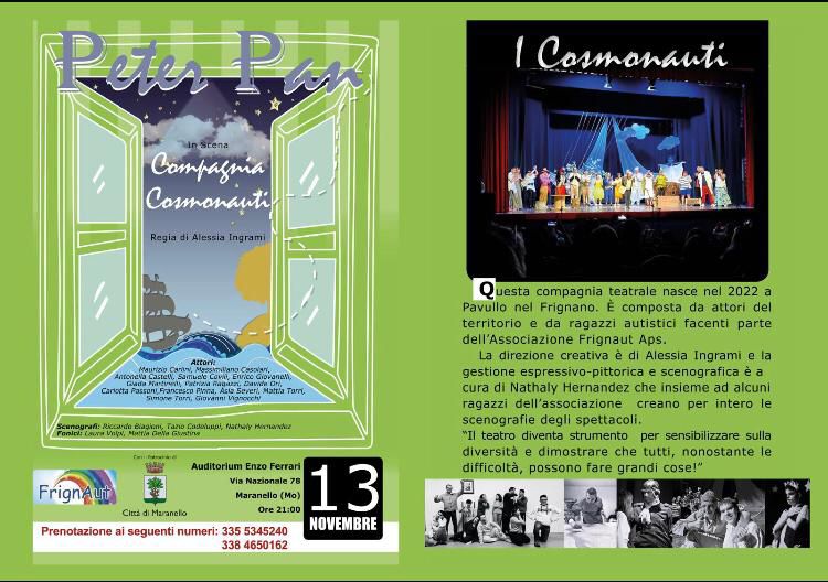 Dopo il grande successo riscosso a Pavullo, la compagnia “I Cosmonauti” torna in scena con una nuova replica del loro spettacolo “Peter Pan”. Il 13 novembre, l’incantevole storia del ragazzo che non voleva crescere prenderà vita sul prestigioso palco dell’Auditorium Enzo Ferrari di Maranello.